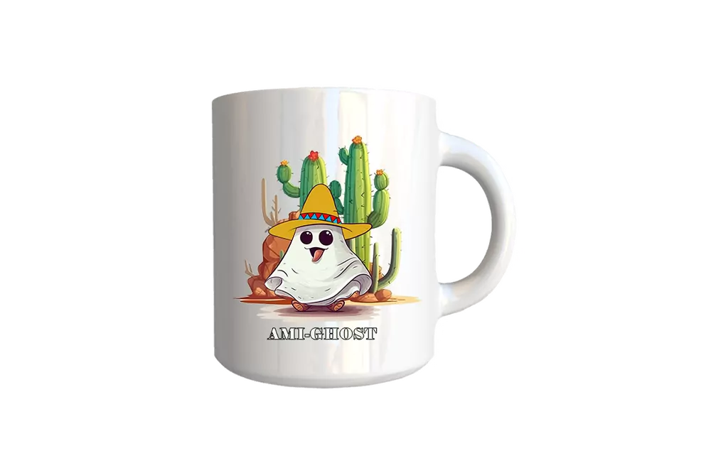 Motiv Ami-ghost lze umístit na plecháček, keramický glazovaný hrnek i na espresso hrnek.