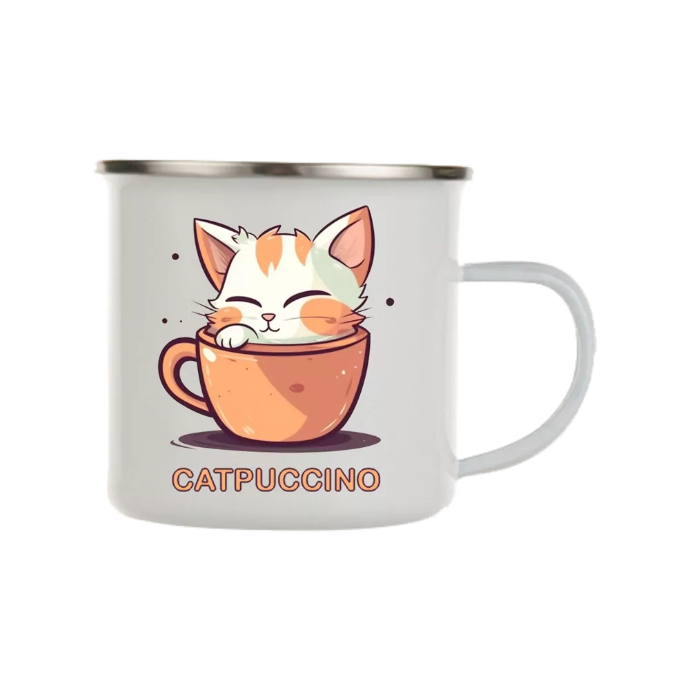 Motiv Catpuccino lze umístit na plecháček, keramický glazovaný hrnek i na espresso hrnek.