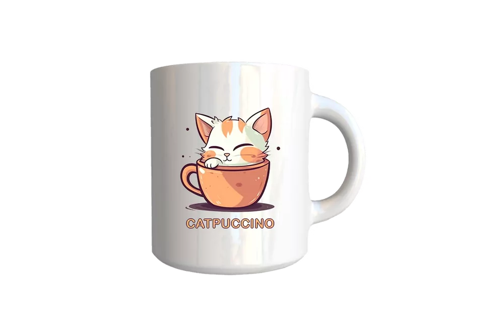 Motiv Catpuccino lze umístit na plecháček, keramický glazovaný hrnek i na espresso hrnek.