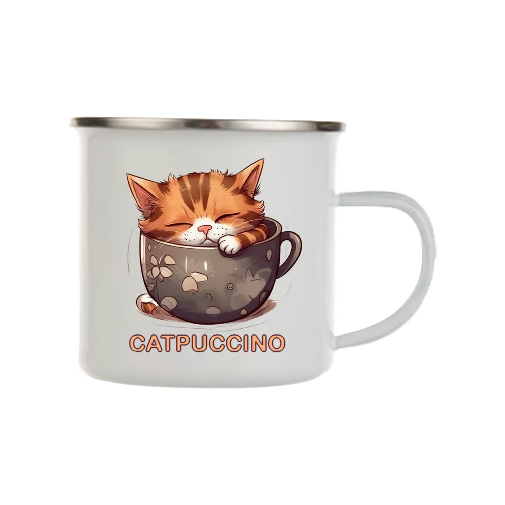 Motiv Catpuccino lze umístit na plecháček, keramický glazovaný hrnek i na espresso hrnek.
