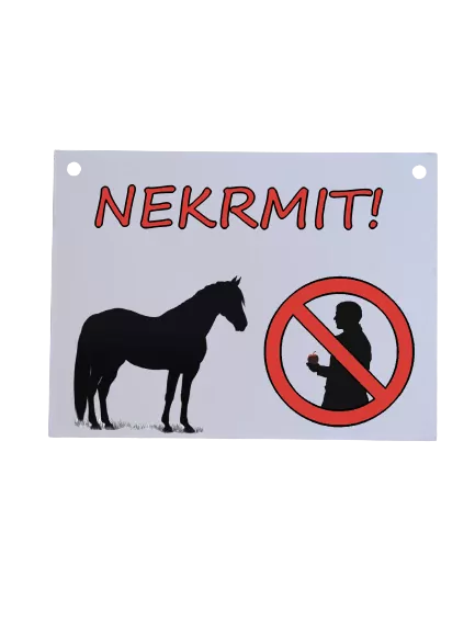 Plechová cedulka vel. 20x15cm s textem "NEKRMIT!", kterou lze upevnit na hrazení výběhu (cedulka má předvrtané 2 otvory v horních rozích).
