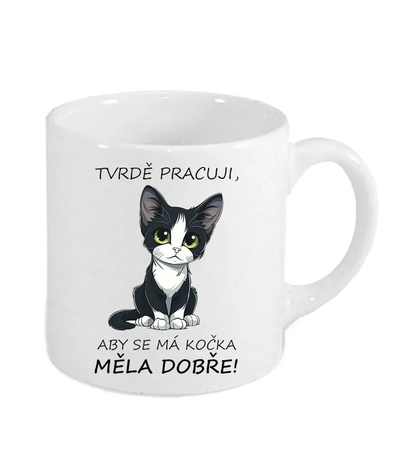 - Hrnek "Tvrdě pracuji, aby..." (kočka)