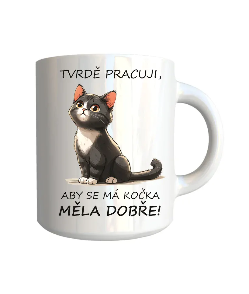 - Hrnek "Tvrdě pracuji, aby..." (kočka)