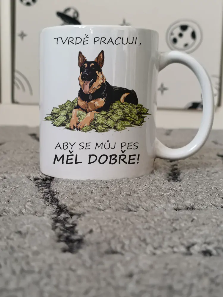 - Hrnek "Tvrdě pracuji, aby..." (pes)