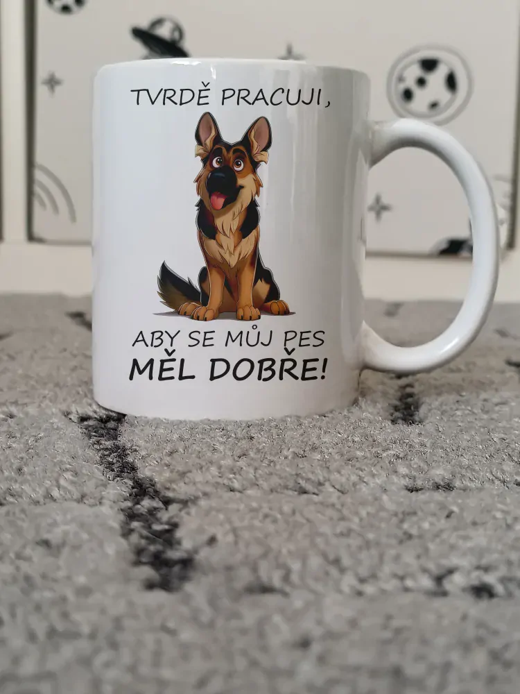4. Hrnek "Tvrdě pracuji, aby..." (pes)